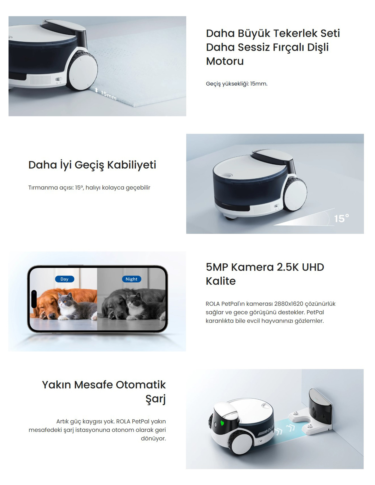 Evcil Hayvanlar İçin Akıllı Asistan ROLA PetPal, evcil dostunuzun güvenliği, eğlencesi ve günlük takibi için tasarlanmış hepsi bir arada bir ev robotudur. AI destekli kamera, otomatik besleyici ve oyun modülleriyle evcil hayvan bakımında yeni bir çağ başlatıyor.