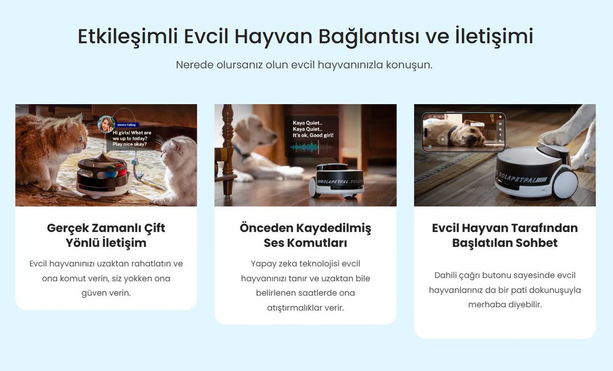 İki Yönlü Sesli İletişim ROLA uygulaması üzerinden evcil dostunuzla gerçek zamanlı konuşabilir, sesli komutlar verebilir ve havlama algılandığında önceden kaydedilmiş mesajlarla onu sakinleştirebilirsiniz.