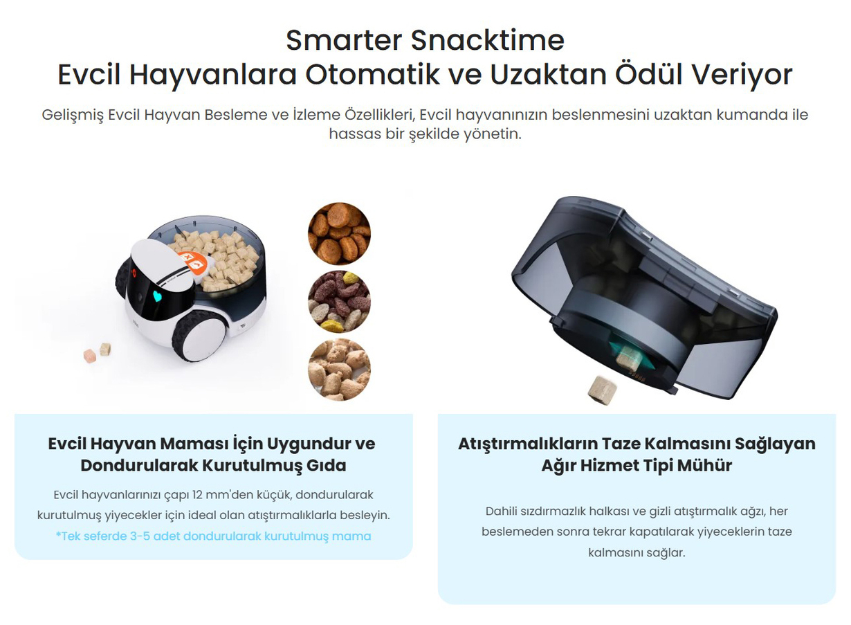 Otomatik Ödül Dağıtımı Opsiyonel ödül modülü, kuru mama ve dondurulmuş atıştırmalıkları hava geçirmez yapısıyla taze tutar. Her beslemede 3–5 parça dağıtarak evcil hayvanınızı ödüllendirir ve beslenme rutinini destekler.