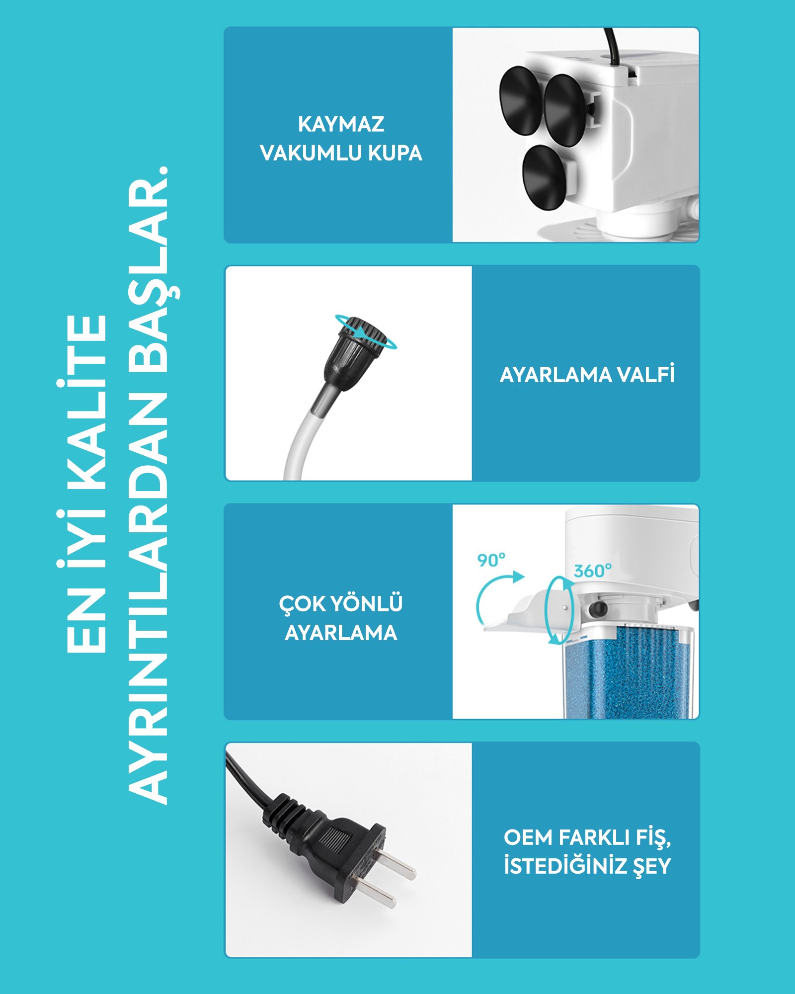 Vantuzlu sabitleme sistemi sayesinde akvaryum içinde esnek konumlandırma yapılabilir.