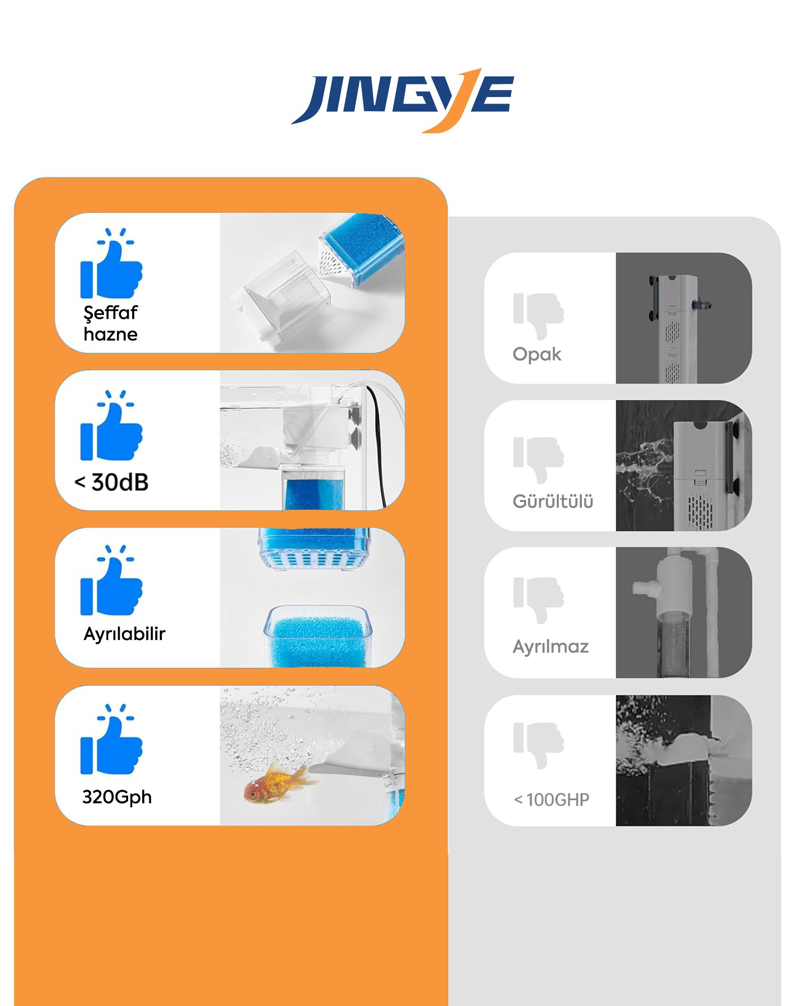Jingye JY-5200F Akvaryum İç Filtresi, beyaz motor bloğu ile akvaryum içinde ferah bir görünüm oluşturur. Şeffaf filtre haznesi sayesinde süngerin kirlilik seviyesi dışarıdan kolayca kontrol edilebilir, bakım zamanını doğru şekilde belirlemenize yardımcı olur.