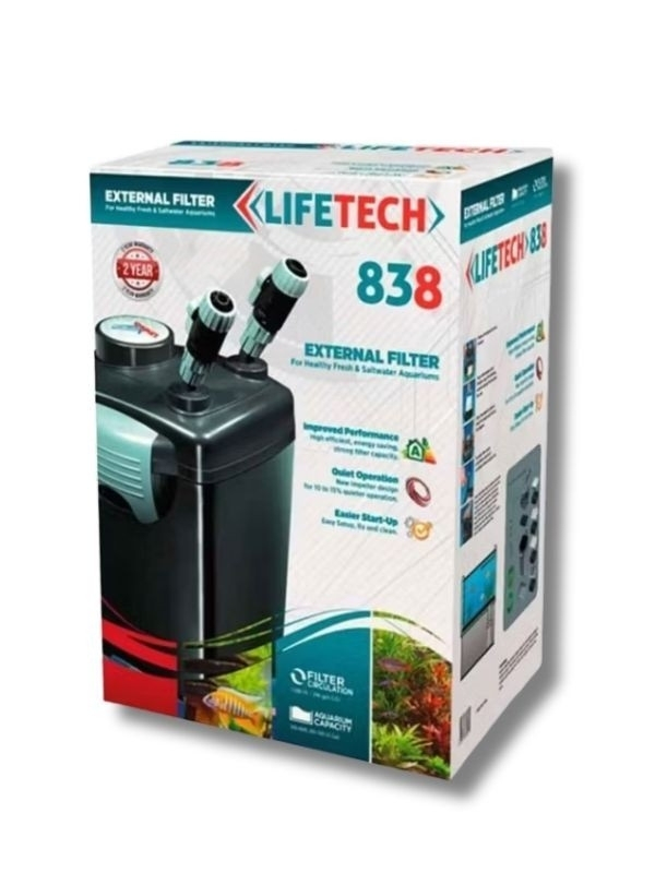 Lifetech 838 Akvaryum Dış Filtresi, tatlı su ve deniz akvaryumları için geliştirilmiş yüksek performanslı filtrasyon sistemidir. 28W motor gücü ve saatte 1200 litre filtrasyon kapasitesi ile mekanik, kimyasal ve biyolojik temizliği etkin şekilde gerçekleştirir.