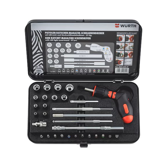 Profesyonel kullanım için tasarlanan WÜRTH 37 Parça Magazinli Tornavida Seti, yüksek performanslı cırcır mekanizması, LED ışık desteği ve geniş uç-adaptör gamıyla her türlü montaj işinde üstün verimlilik sunar.