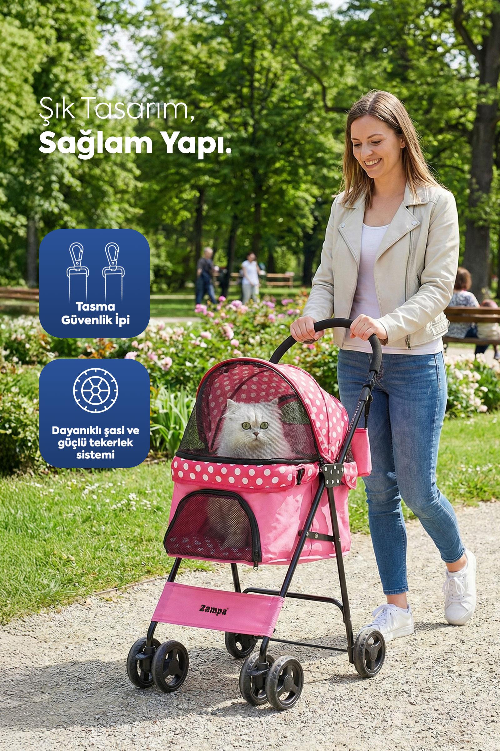 Zampa Perez BL07-P pembe evcil hayvan arabası, tarz sahibi evcil hayvan sahipleri için ideal bir tercih. Pembe rengi ile göz alıcı, sağlam çelik gövdesi ve %100 polyester oxford kumaşı ile uzun ömürlü bir kullanım sunar.