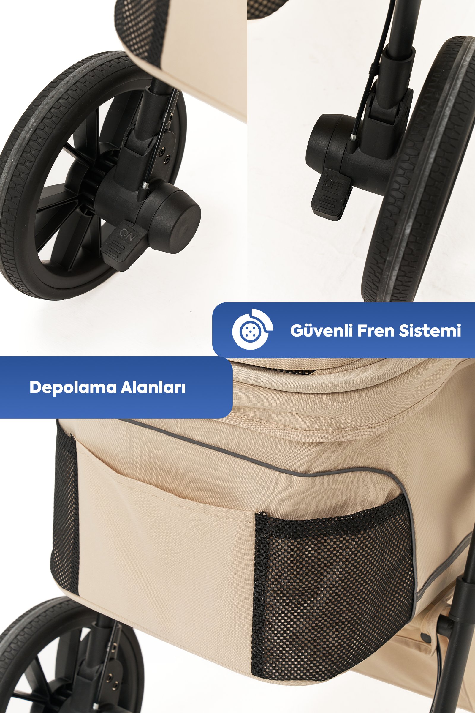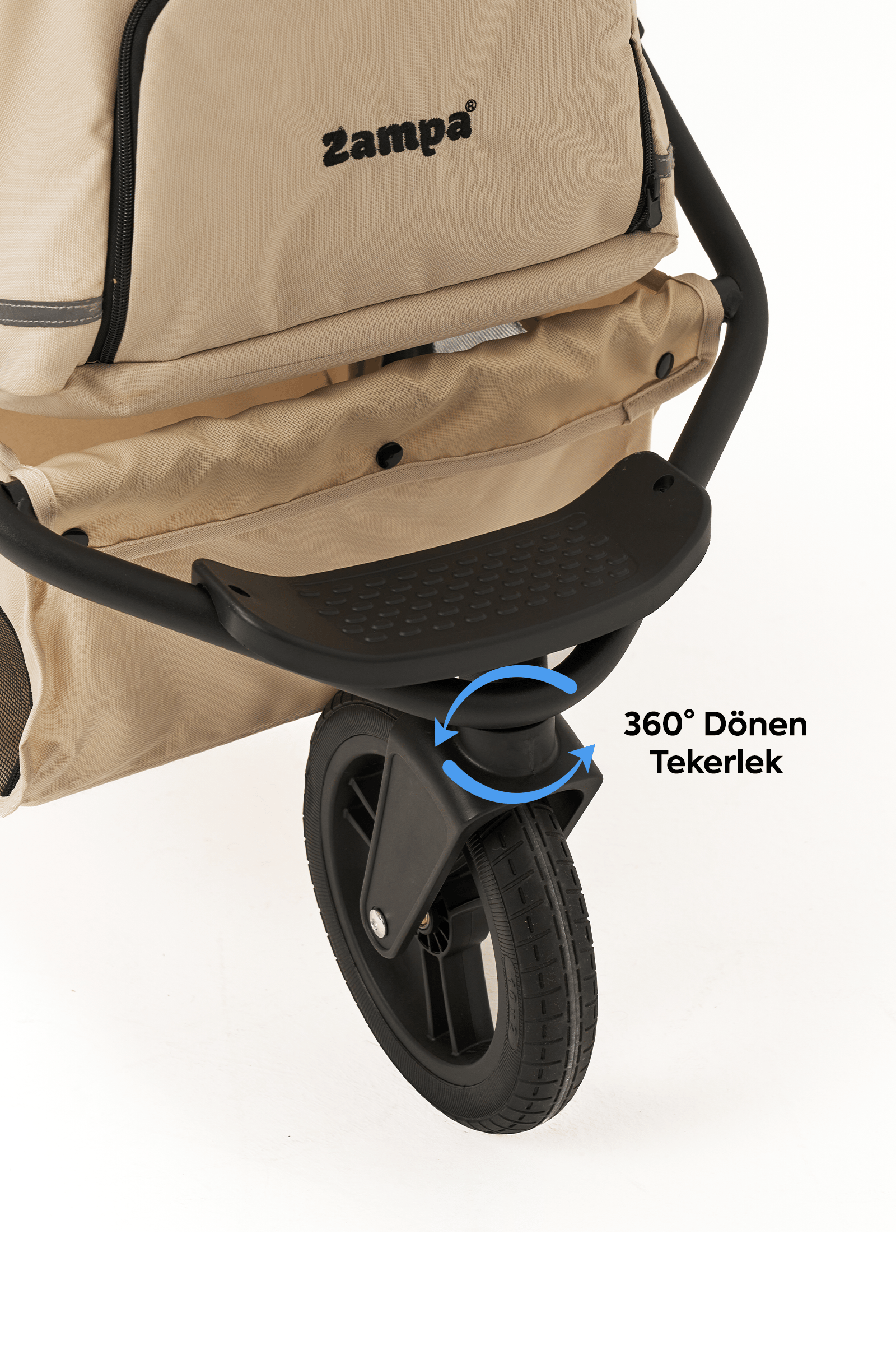 360° dönebilen ön tekerlekler ve arka fren sistemi ile dar alanlarda bile kolay yönlendirme sağlar. Eğimli yollarda güvenli sabitleme imkânı sunar.