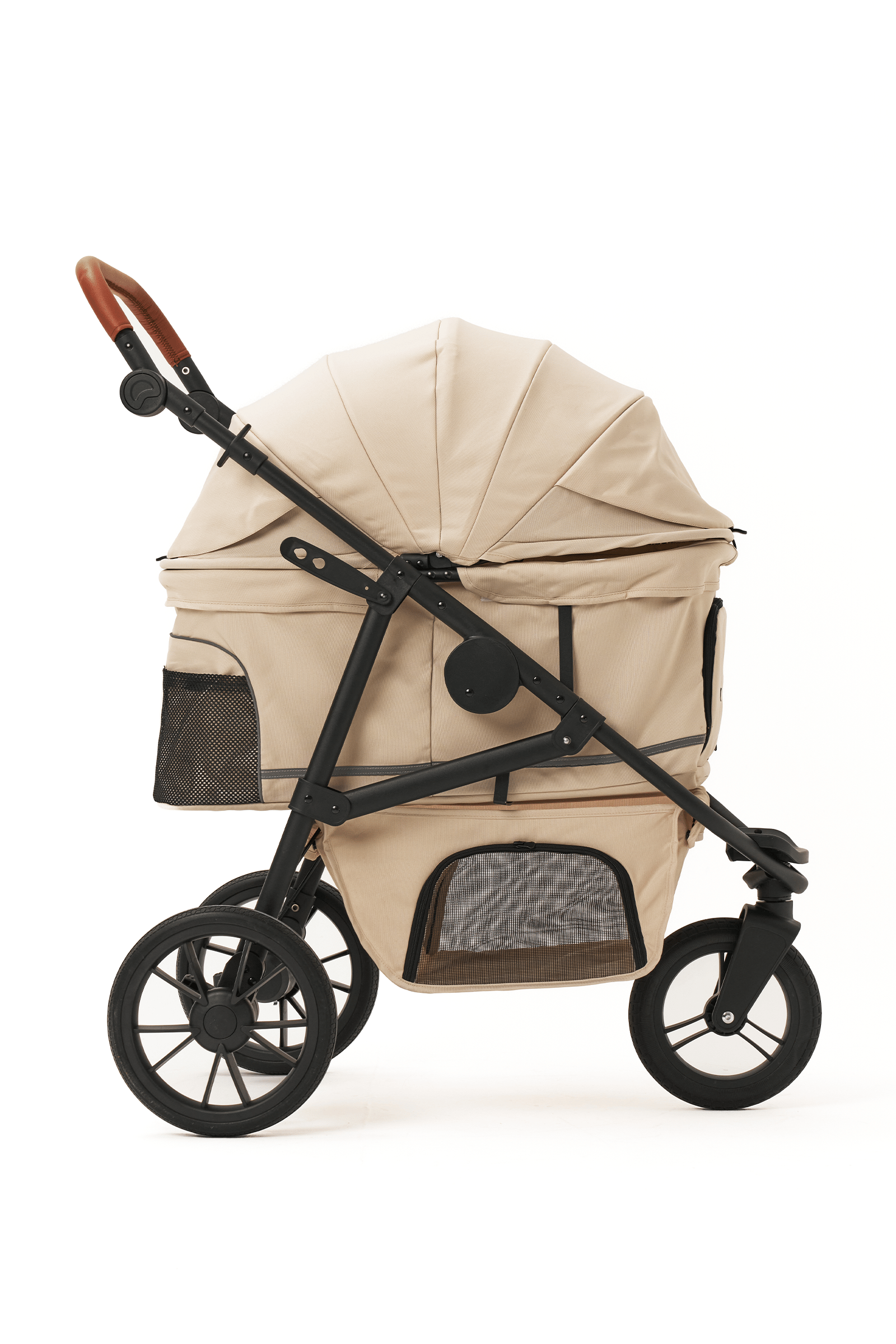 İtme koluna entegre bardaklık ve organizer tepsisi sayesinde kahvenizi, telefonunuzu veya ödül mamalarını kolayca taşıyabilirsiniz. Alt kısımdaki geniş sepet alışveriş poşetleri ve oyuncaklar için idealdir.