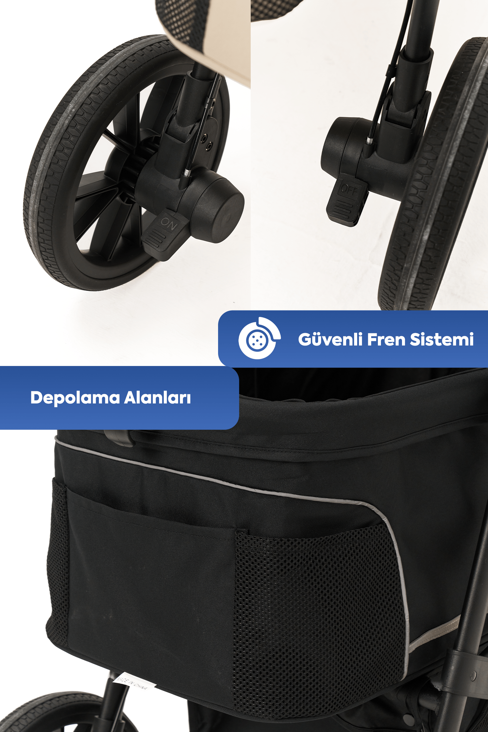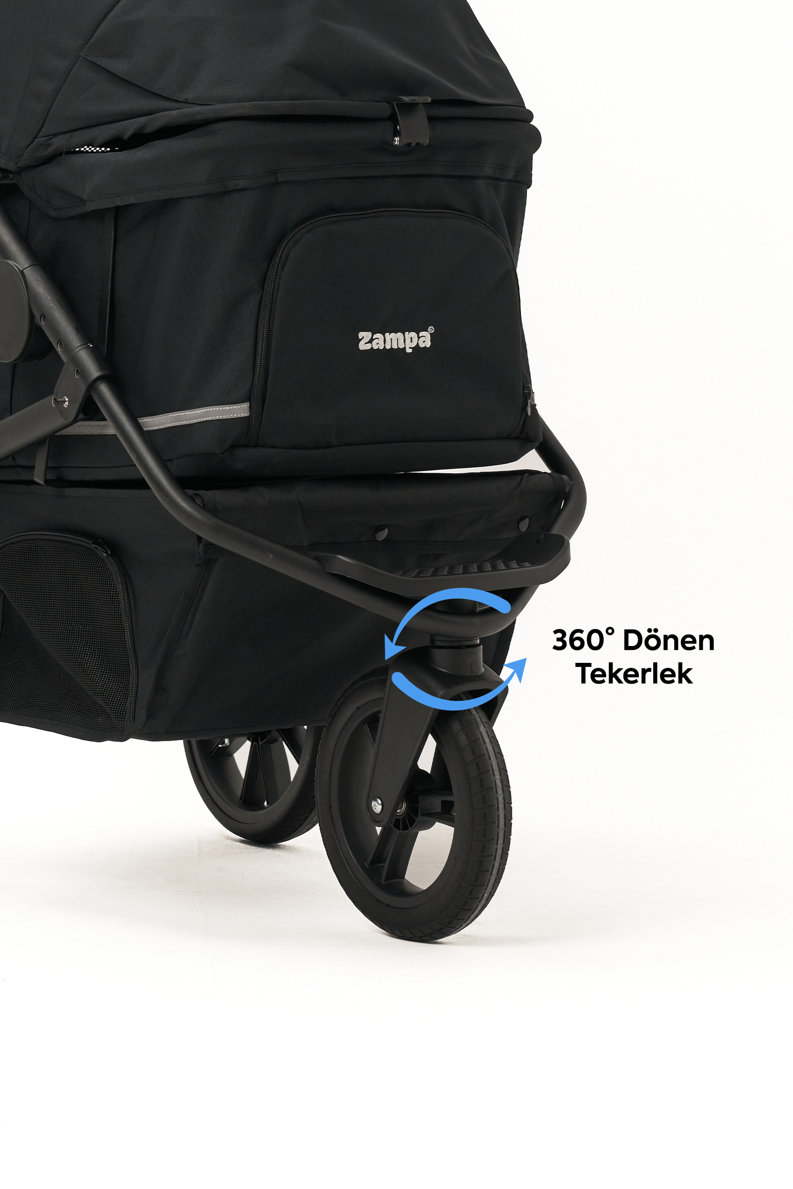360° dönebilen ön tekerlekler ve arka fren sistemi ile dar alanlarda bile kolay yönlendirme sağlar. Eğimli yollarda güvenli sabitleme imkânı sunar.